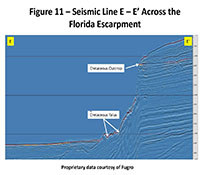 - anomaly_Cretaceous, outlined in blue in Figure 1 and directly following the northern Florida Escarpment are long, linear high-positive amplitude anomalies extend along the face of the escarpment and, from several dives with manned submersibles and ROVs, have been found to be outcrops of Cretaceous-aged, well-indurated carbonate stratum. Each dive has proven these locations act as prime substrate for coral communities. Seismic data and paleontological data from well control on the Florida Platform establish the Cretaceous age of these rocks. The polygons in the anomaly_Cretaceous shapefiles are those mapped on 3-D seismic data; though there are 2-D data sets to the south along the escarpment, they are not amplitude balanced and were not used to develop this shapefile data set. Figure 10 is a bathymetry/amplitude map across the Florida Escarpment with the Cretaceous carbonate outcrops outlined in blue. Figure 11 is a seismic traverse (E-E’) across the escarpment.