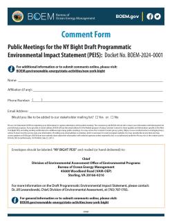 On Jan. 8, 2024, BOEM announced the availability of its Draft Programmatic Environmental Impact Statement (Draft PEIS) for potential development of six wind lease areas offshore New York and New Jersey in an area known as the New York Bight. On Jan. 12, 2024, BOEM published a notice of availability of the Draft PEIS, opening a 45-day public comment period that ended on Feb. 26, 2024.