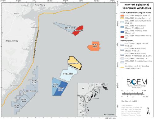On February 23, 2022, BOEM held an offshore wind auction for six lease areas in the New York Bight area. Attentive Energy LLC was identified as the winner of Lease Area OCS-A 0538 (84,332 acres) located in federal waters approximately 36 nautical miles (nm) offshore New Jersey and 47 nm offshore New York.