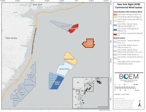 On February 23, 2022, BOEM held a competitive lease sale offshore New York and New Jersey. Bluepoint Wind, LLC was identified as the winner of Lease Area OCS-A 0537 (71,522 acres) located in federal waters approximately 38 miles offshore New York and 53 miles offshore New Jersey.