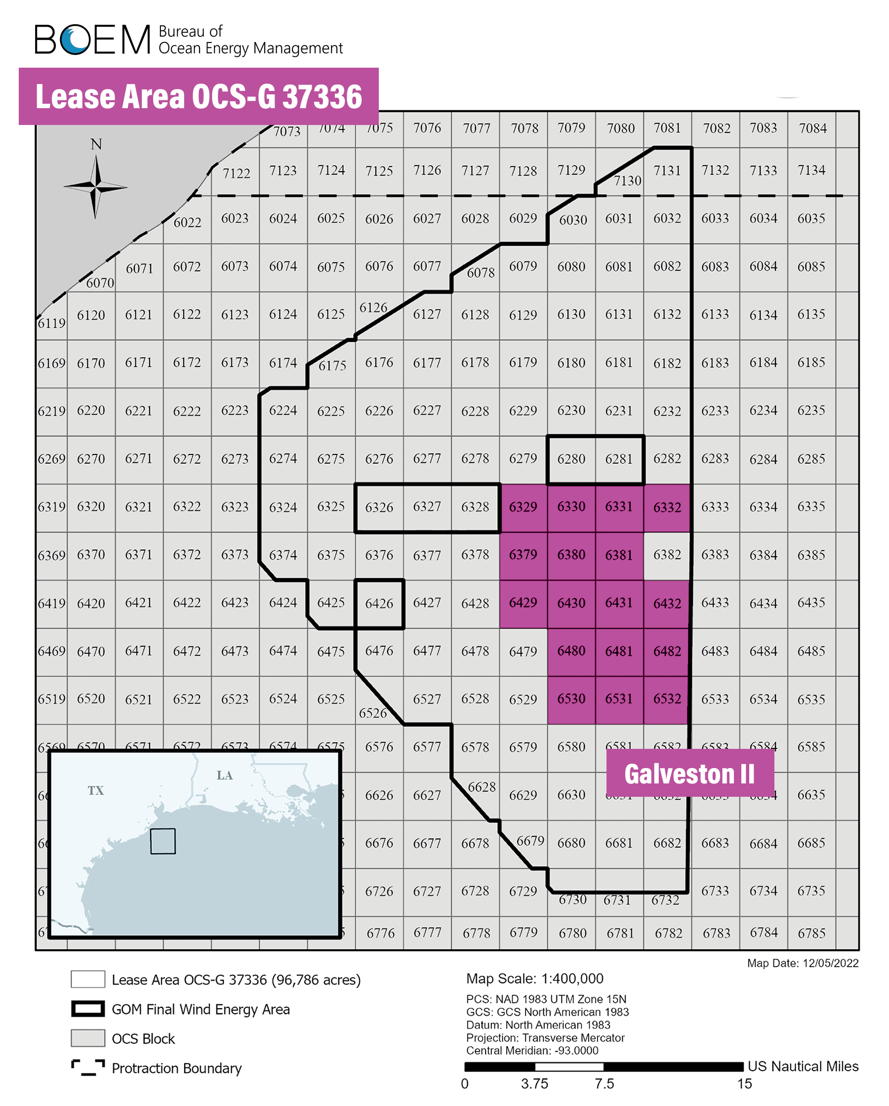 On October 31, 2022, BOEM announced it has finalized two Wind Energy Areas (WEAs) in the Gulf of Mexico. The first final WEA is located approximately 24 nautical miles (nm) off the coast of Galveston, TX. The area totals 508,265 acres and has the potential to power 2.1 million homes with clean wind energy. The second final WEA is located approximately 56 nm off the coast of Lake Charles, LA. The area totals 174,275 acres and has the potential to power over 740,000 homes. The next steps in BOEM’s renewable energy competitive leasing process include issuing a Proposed Sale Notice for a 60-day public comment period later this year or early next.