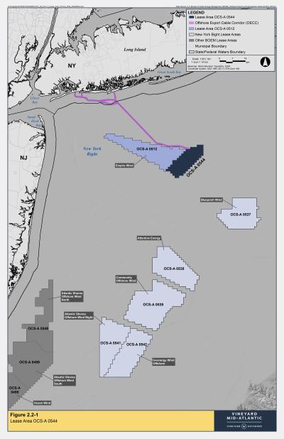 On February 23, 2022, BOEM held a competitive lease sale offshore New York and New Jersey. Vineyard Mid-Atlantic, LLC was identified as the winner of Lease Area OCS-A 0544 (43,056 acres) located in federal waters approximately 20 miles offshore New York and 36 miles offshore New Jersey.